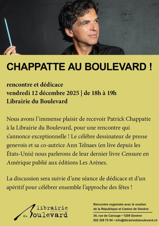 Nous avons l’immense plaisir de recevoir Patrick Chappatte à la Librairie du Boulevard, pour une rencontre qui s’annonce exceptionnelle ! Le célèbre dessinateur de presse genevois et sa co-autrice Ann Telnaes (en live depuis les États-Unis) nous parlerons de leur dernier livre Censure en Amérique publié aux éditions Les Arènes.