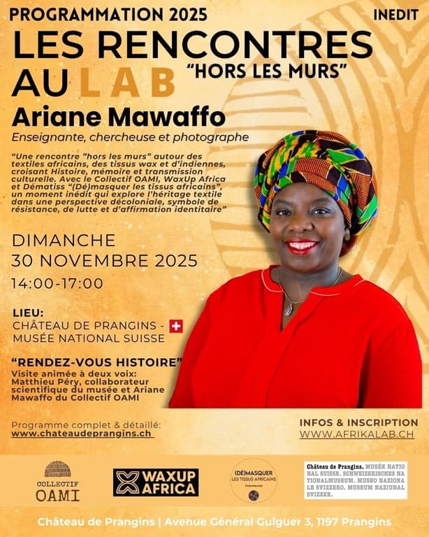 Ariane Mawaffo, enseignante, chercheuse et photographe genevoise d’origine camerounaise, explore le rôle des tissus africains comme vecteurs de mémoire, d’identité et de transmission. Aux côtés du Collectif OAMI et de la marque WaxUp Africa, elle présentera comment les tissus wax et indiennes ont traversé les époques, navigué entre héritages coloniaux et résistances culturelles.