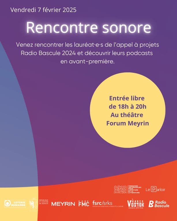 Rencontre sonore : Rendez-vous le vendredi 7 février de 18h à 20h au Théâtre Forum Meyrin pour découvrir en avant-première les créations sonores des lauréat·e·s 2024. Une expérience immersive unique !