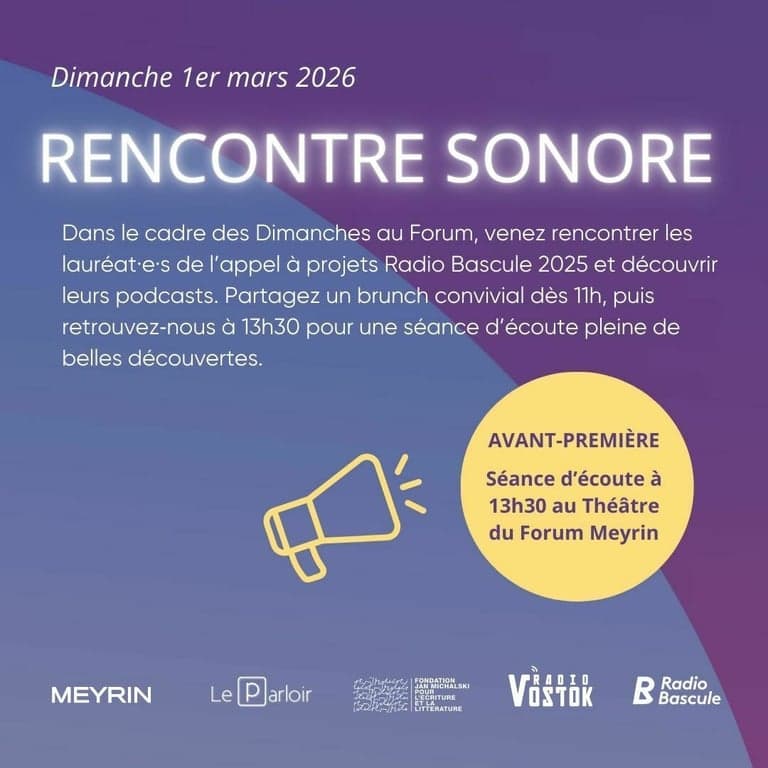 Dans le cadre des Dimanches au Forum, venez rencontrer les lauréat·e·s de l’appel à projets Radio Bascule 2025 et découvrir en avant-première leurs podcasts. Partagez un brunch convivial dès 11h, puis retrouvez‑nous à 13h30 pour une séance d’écoute pleine de belles découvertes.