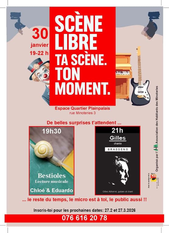 Profitez de l'opportunité qu'offre une scène sonorisée pour vous lancer dans un one man show, un slam, un spectacle musical, un stand up, etc... etc... La scène est à vous durant 3 hres chaque dernier vendredi du mois (de 19 à 22hres)