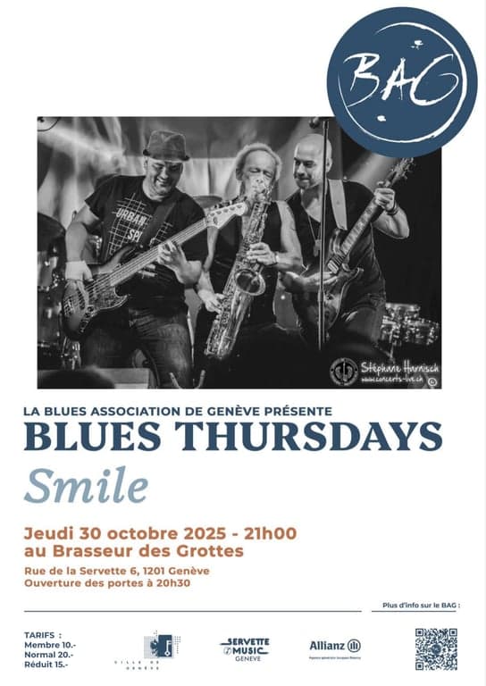 SMILE est un groupe de blues, rock-blues et rhythm'n blues qui existe depuis 31 ans et a plus de 600 concerts et 4 CD’s à son actif ! Le groupe reprend des morceaux des années 60-70 mais en les travaillant à sa manière. Mais SMILE, c’est aussi et surtout un groupe de scène très pro et plein d’énergie dont la passion est de partager sa musique et de tout donner à son public ! Ambiance garantie !