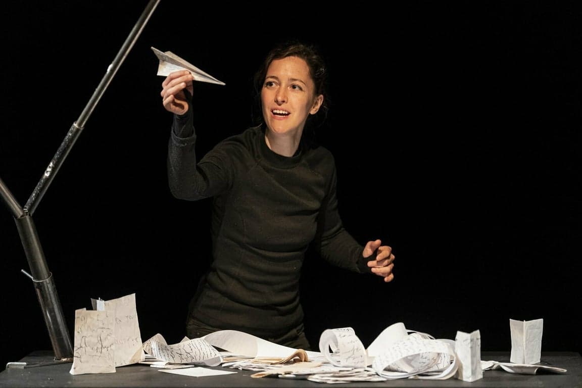 Sur une grande table noire, un petit être de papier écrit une lettre à son enfant. La manipulatrice, en utilisant des morceaux de métal et des ribambelles de papier, raconte l’histoire de sa famille et célèbre la transmission des mots et de l’amour.