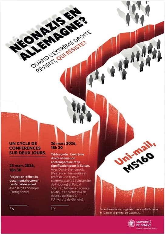 Un cycle de conférences «Quand l’extrême droite revient, qui résiste ?» discutera de cette situation. Deux soirées publiques pour comprendre la montée actuelle de l’extrême droite en Allemagne et ses répercussions en Suisse. L’événement est organisé dans le cadre du cours «Gestion de projet» du Global Studies Institute (GSI) de l’Université de Genève.