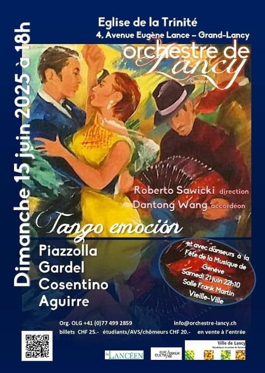 Avec «Tango emoción» Roberto Sawicki, les musiciens de l’Orchestre de Lancy-Genève et Dantong Wang soliste, proposent un parcours musical chatoyant et mystique à travers l'Argentine qui commence avec les compositions de Julian Aguirre (1868-1924) « Huella y Gato » et « Aires Criollos » empreintes de la fraîcheur des rythmes folkloriques d’origine et de leur esprit populaire même lorsque l’harmonie, le rythme ou le contrepoint se font plus complexes, un itinéraire qui passe ensuite par le célèbre tango « Por una cabeza » de Carlos Gardel (1890-1935) émouvant et sensuel puis une touche d’humour portègne avec Milongón de Bernardo Stalman (1910-2004) pour nous amener vers les rythmes intensément évocateurs passionnés et vibrants d’Astor Piazzolla (1921-1992) comme « Escualo » « Vardarito » «Fuga y Misterio» « Oblivion » et d’autres, avec en création suisse deux œuvres de Saul Cosentino (1935), compositeur vivant, contemporain et ami de Piazzolla dont les tangos élégamment nostalgiques et pourtant teintés d’espoir « Como debe ser » et Fuera de Serie » sont un hymne d’amour à Buenos Aires.