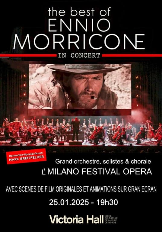 Les fans de Morricone pourront entendre ses œuvres inoubliables en live dans diverses villes suisses. Quatre-vingts musiciens et chanteurs du Milano Festival Opera, placés sous la direction du célèbre chef d’orchestre Marco Seco, se produiront sur scène et redonneront ainsi vie à la musique captivante de Morricone.