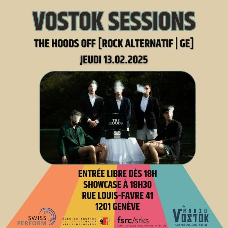 The Hoods Off est un groupe suisse de rock alternatif fondé en 2015 par Léo Bordier. Composé d’Elias Romanelli (chant, guitare rythmique), Eliott Trümpler (basse), Léo Bordier (batterie), Fabrice Reymond (guitare lead), Diego Castro (chœurs) et Bruno Barandun (ingénieur son), le groupe mêle énergie post-punk et influences variées.