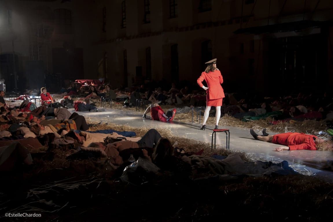 Une création de Jacques Livchine et Hervée de Lafond / Avec : Julie Cazalas ou Inès Lopez, Ludo Estebeteguy, Fabrice Denys, Catherine Fornal, Garance Guierre ou Anne de Broca, Hervée de Lafond, Jacques Livchine, Charlotte Mainge, Léonor Stirman ou Mélanie Collin-Cremoni et un bouvier bernois (Mariole) / Lumières : David Mosse ou Maël Palu / Régie Son : Erik Billabert ou Thierry Jungblut / Administration tournée : Paco Bialek / Administratrice théâtre : Claudine Schwarzentruber / Production : Théâtre de l’Unité / Soutien : DRAC région Bourgogne / Franche-Comté, Conseil Départemental du Doubs, Ville d’Audincourt, Pays de Montbéliard Agglomération La Transverse – Corbigny, Lieux publics – Centre National de Création des Arts de la Rue – Marseille