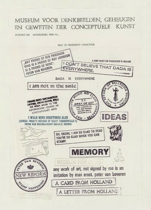 Oeuvre: Peter van Beveren (1952), Sans titre, 2e moitié 20e s., empreintes de tampons à l'encre bleue, photocopies d'empreintes de tampons, découpages et collages (pas d'origine), sur papier à en-tête, 297 x 210 mm, inv. E 2025-0328-122, © MAH