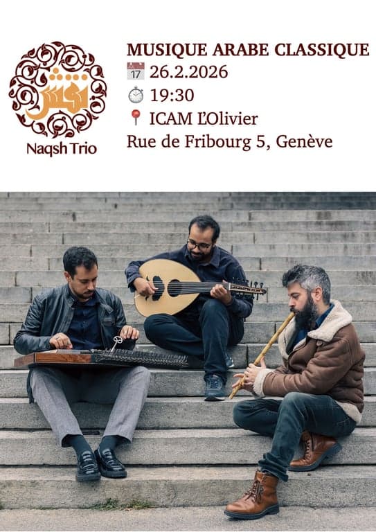 Naqsh (نقش), qui signifie « ornement » en arabe, a été fondé à Genève en 2025 et explore la richesse de la musique arabe classique à travers les maqamat, le système modal au cœur de la tradition. Alliant répertoire historique, compositions contemporaines et improvisation, le trio s’engage dans l’interaction entre maqam et usul (cycles rythmiques). Entre structure et spontanéité, Naqsh offre un portrait vivant et évolutif de la musique arabe, profondément ancré dans la tradition.