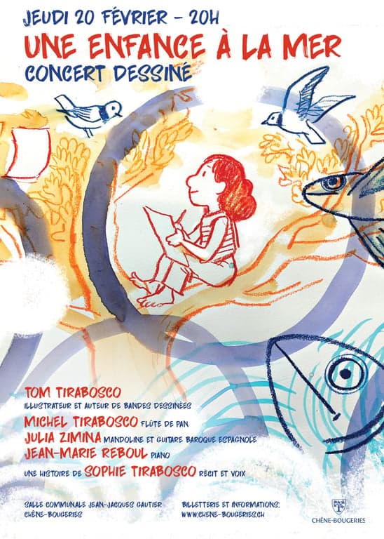 Cette ode à l’enfance est un voyage lumineux où l’imaginaire sublime le monde et l’agrandit. La voix de Sophie Tirabosco invite le pinceau de Tom Tirabosco (illustrateur et auteur de bandes dessinées), la musique de Michel Tirabosco (flûte de pan), Julia Zimina (mandoline et guitare baroque, espagnole) et Jean-Marie Reboul (piano) à continuer l’histoire…