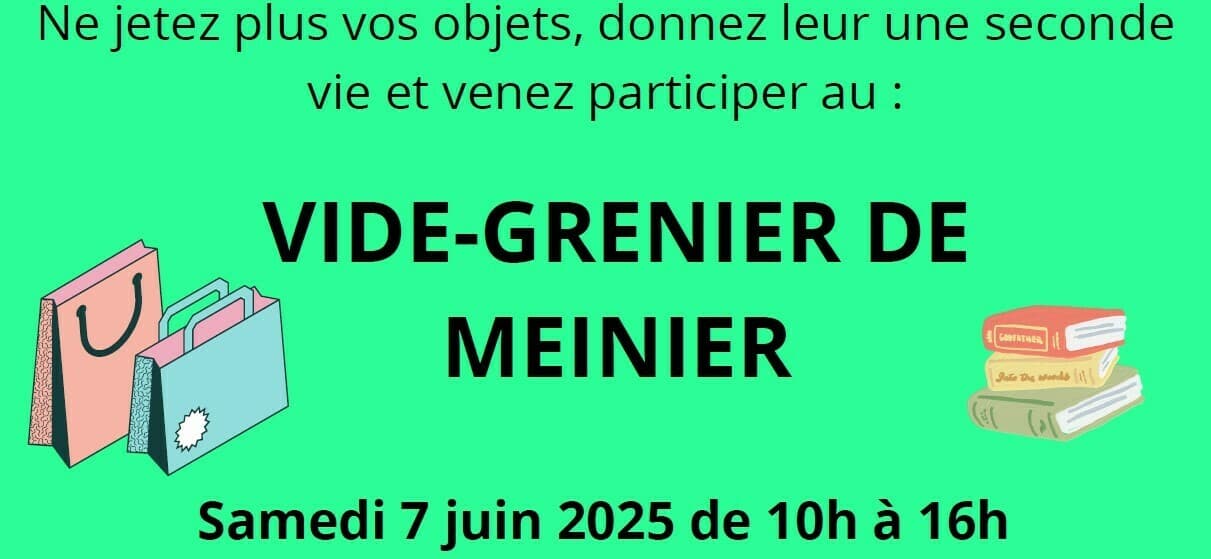 Le traditionnel vide-greniers de Meinier se tiendra le samedi 7 juin 2025 de 10h à 16h sur l'esplanade de la salle communale.