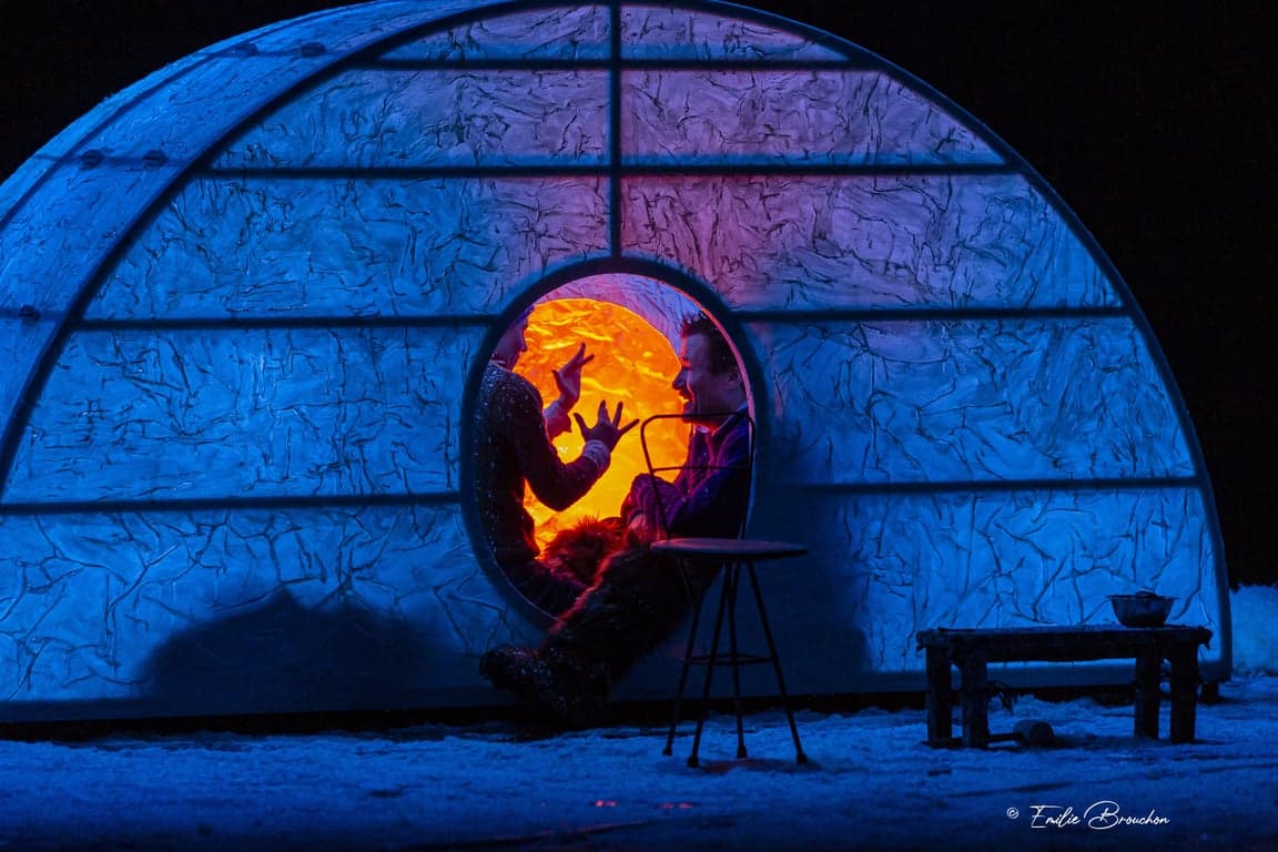 Le rideau s’ouvre sur un igloo recouvert de peaux de bêtes sur lequel sont perchés deux personnages, une jeune fille et un homme, dans un village imaginaire, où l’argent n’existe pas, appelé Okionuk et situé aux confins du monde. Youma, quatorze ans, sourde et muette, raconte le destin tragique de son village, grâce à son compagnon et interprète, Gurven. Seule rescapée du désastre, sauvée grâce à sa différence, elle a vu sa communauté perdre l’usage du langage après l’avoir vendu à un marchand de passage malintentionné. Peu à peu, les villageois ont échangé des mots qu’ils pensaient inutiles contre des objets. Au fur et à mesure, ils ont défait les liens qui les unissaient en bradant leur langue.