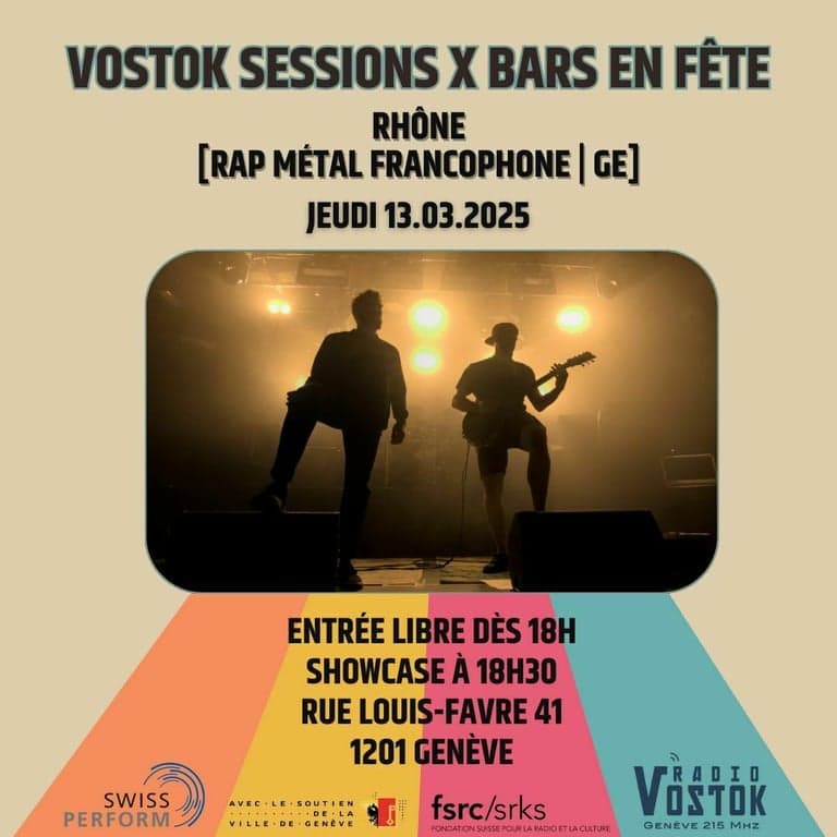Rhône répand sa distorsion au travers de textes limpides et de ri s puissants. Depuis les rives genevoises, le groupe imprime une énergie pure, brute, à faire sauter les barrages. Inspirez par le nez, expirez par le cœur, préparez-vous à être submergé. Avé ! Rhône répand sa distorsion au travers de textes limpides et de ri s puissants. Depuis les rives genevoises, le groupe imprime une énergie pure, brute, à faire sauter les barrages. Avec la force d’une pluie battante, les ows du MC s’allient à une guitare et une batterie dans une formule simple, minimaliste. Une plume aiguisée, des couplets scandés, comme des mantras, pour délivrer d’une existence morne. Rhône c’est une ambiance sombre, brumeuse, une odeur de goudron. Rhône c’est de l’alchimie: de la musique pour construire un feu, en attendant que pousse une eur. Inspirez par le nez, expirez par le cœur, préparez-vous à être submergé. Avé !